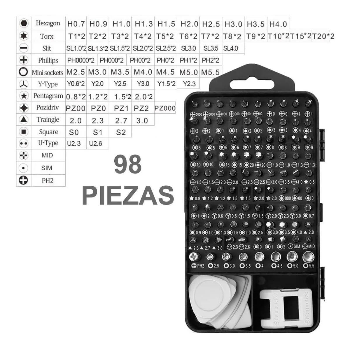 Pozidriv, Y-Type, Pentagrama, Triángulo, U-Type, cuadrado, G-Spread, Mini sockets, SIM,